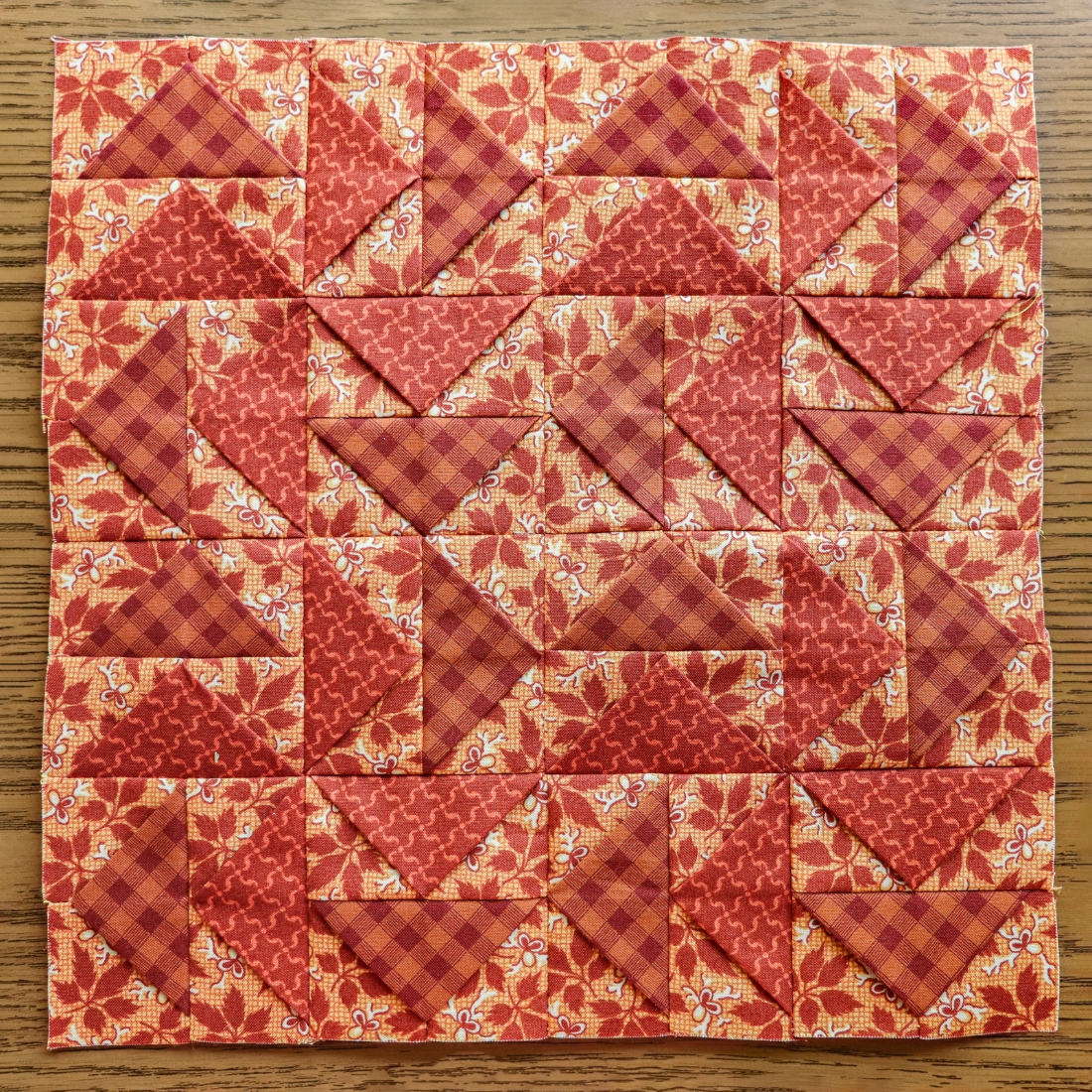 From here, assembly is the same as previous weeks. Arrange Flying Geese units into 16 pairs and sew together. Then arrange and sew the pairs together into a block, as shown below.