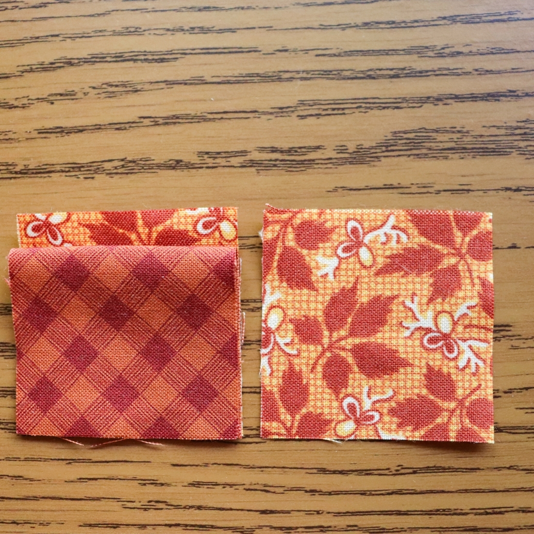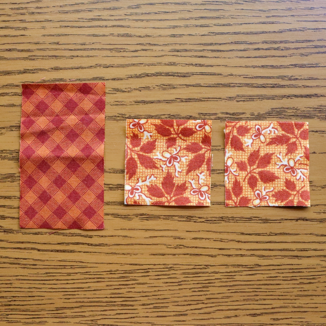 (1) 6" x 3" rectangle, subcut diagonally from the center to the corner on both ends to get two 3" x 3" Half Square Triangles, and one larger 6" x 3" Flying Geese triangle (as shown below)