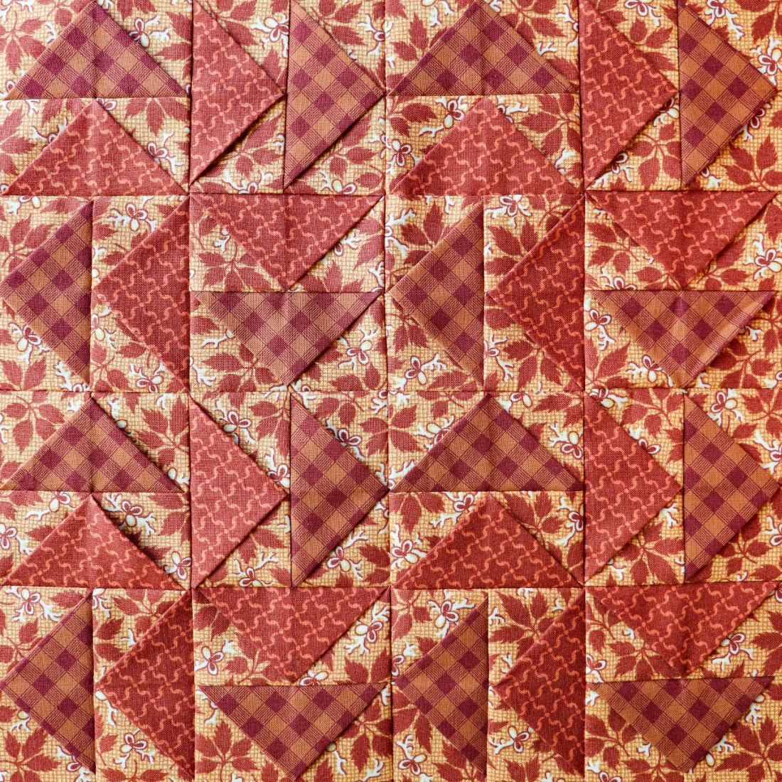 “This block was first published under the name ‘Wheel’ in 1894. And looking at it in September of 2025, I think of the winds now knocking black walnuts from branches which grew so heavy throughout August that many dragged the ground. I enjoyed sitting outside to stitch this week’s block over a beautiful weekend. I hope you have fun ushering in a new season, too.” -Emily Cross, Ozark Modern Crafting