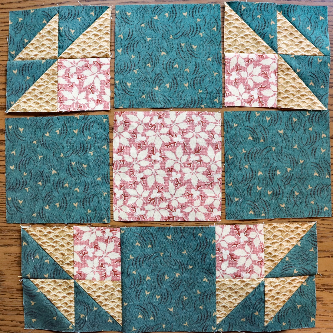 Arrange the units and patches as shown above and sew together into three rows. Make sure to pass through the seam at intersections.