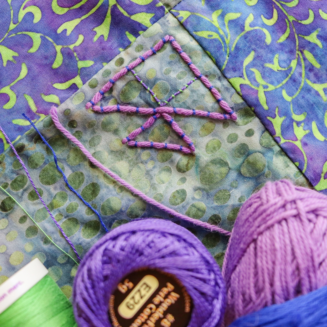 I knew I wanted to add some more fish to the batik colorway of the Fish block I made in week 1. So I used some scraps to make myself a little tester piece. Then I started looking in my yarn, floss, and thread collection for options in the color family of the block itself. I pulled options of different weights and colors to test stitch. I would roll out a bit of thread or yarn and hold it against the fabric, against the block, and against one another, ruling options out as I compared.