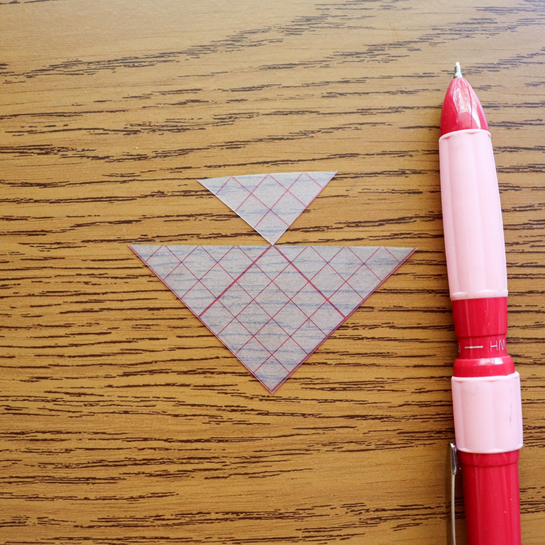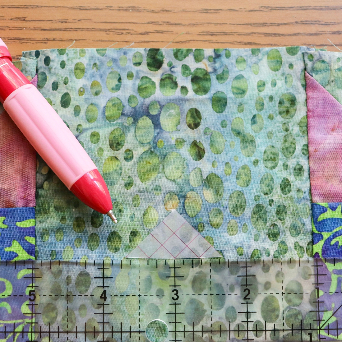 I used templates to create a motif and mark my block for stitching. I used a 2" Half Square Triangle (HST) and a 1" HST template, a ruler, and a marking pencil.