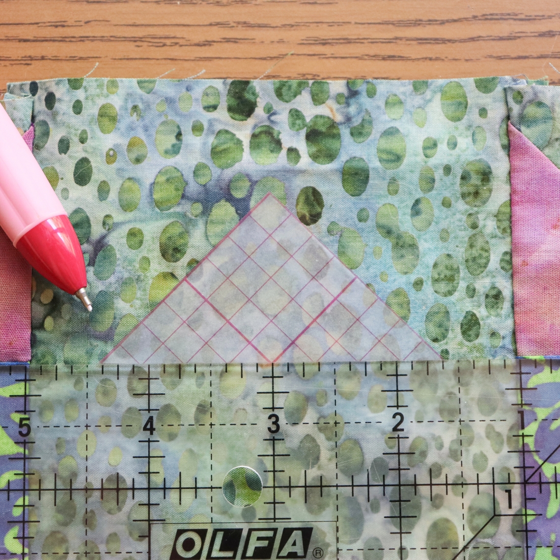 I wanted the long line of the HST to line up with the bottoms of the pink HST to either side of them, so I set my ruler across that line and centered the template using the measurements. Then I marked the corners.