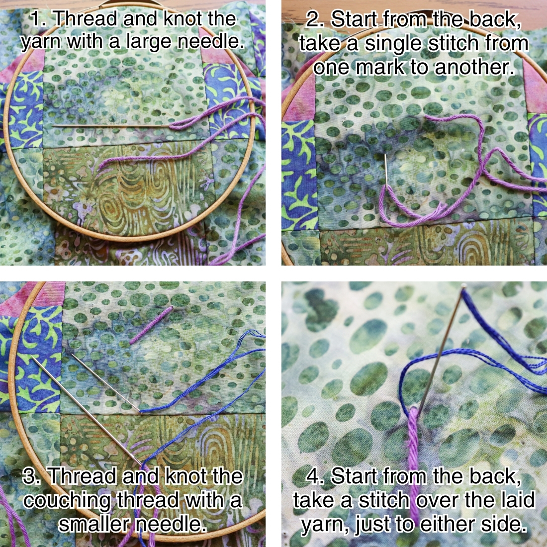A few years ago, I made a tutorial showing a very large-scale version of couching using a thick cord and embroidery floss on wool. Follow along there to see the stitch in motion and get a sense of this simplified couching technique that doesn’t hide the tails of the laid material.