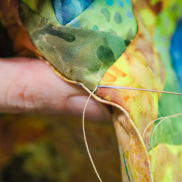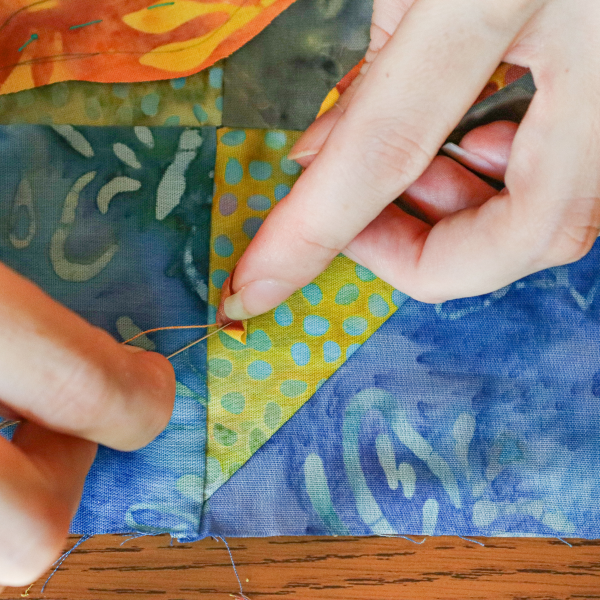 Thread a straw needle with thread that matches the appliqué piece, and tie a quilter’s knot in the end. Fold over the edge of the appliqué piece and come up through all the layers, catching the very edge of the folded fabric. Put the needle back down into the background parallel to where it came out of the appliqué piece. Push the needle back up through the layers, catching the edge of the folded fabric again.