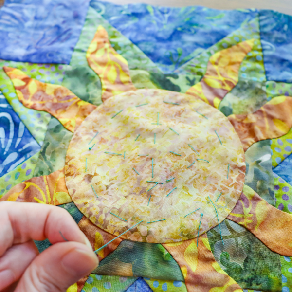 Repeat the whole process for the remaining sun petals until all are attached. Now it’s time to stitch down the sun circle.