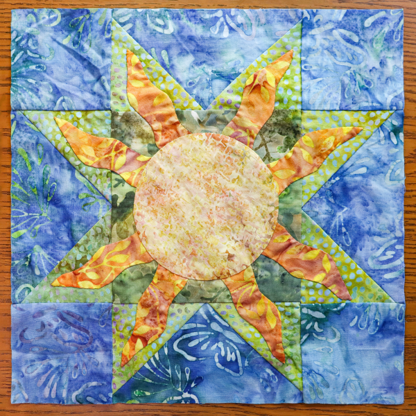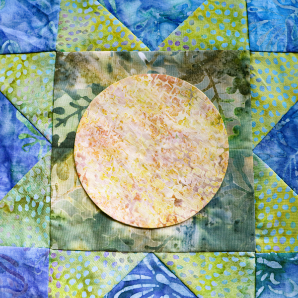 The Sun! This would be the appliqué subject. Then the work of designing an appliqué motif begins. I identified the shapes I needed to bring my vision to life: a circle, 8 sun petals which would shine out into the star points.