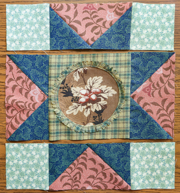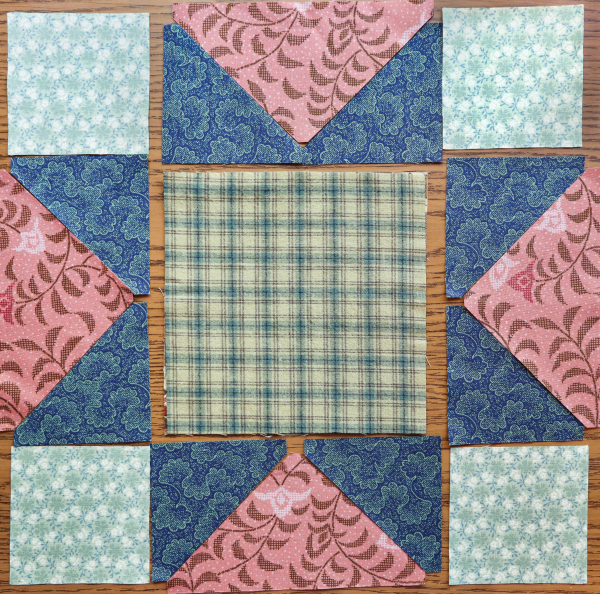 Arrange the units and patches as shown above and sew together into three rows. Make sure to pass through the seam at intersections.