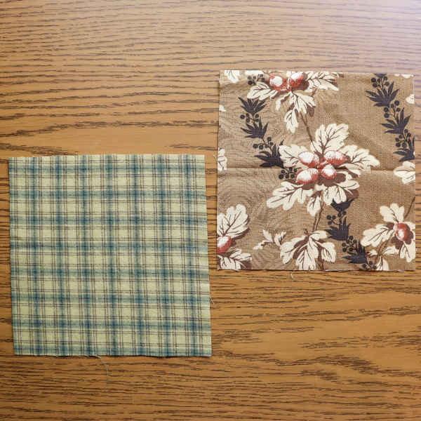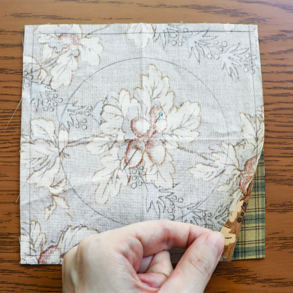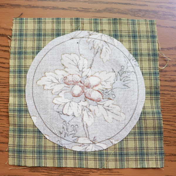 Start with two Center Square pieces. I’m using the plaid for the top layer and the fussycut acorns and oak leaves cluster fabric for the bottom layer.