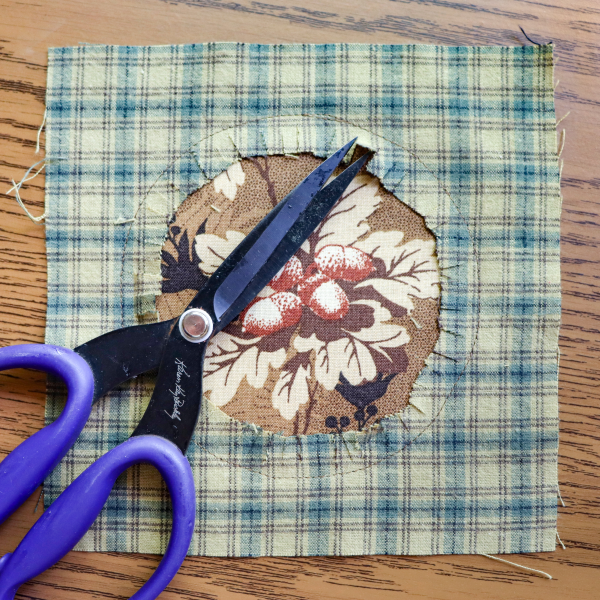 I snipped all around the circle’s edge in ¼” increments to add an extra shabby chic charm that was all the rage when I was a new quilter in the mid-2000s. As a final bit of fun, I ended up pressing the snipped bits away from the center and sewing another round of topstitching to make my raw edge flair out. Have fun creating something that excites you!