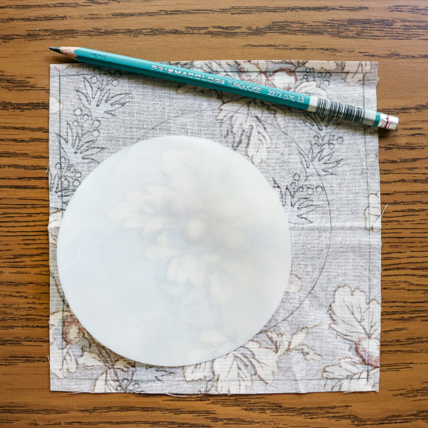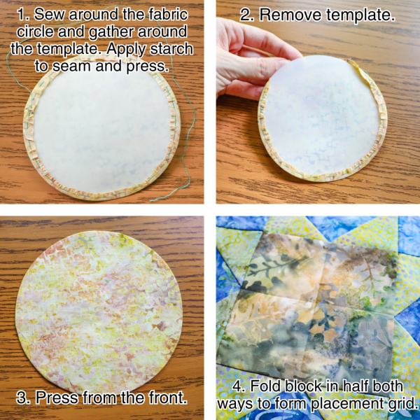 Trim fabric larger than the circle template. Sew around the circle and gather the fabric around the template. Spray some starch into a small bowl and use a paint brush or cotton swab or fingertip to apply the starch around the gathered seam. Press flat.