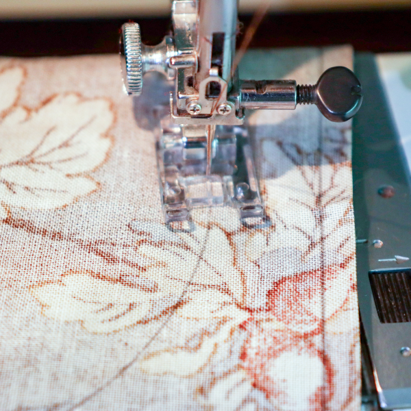 Layer the two fabrics so that the right side of the bottom layer and the wrong side of the top layer are together. Pin in place.