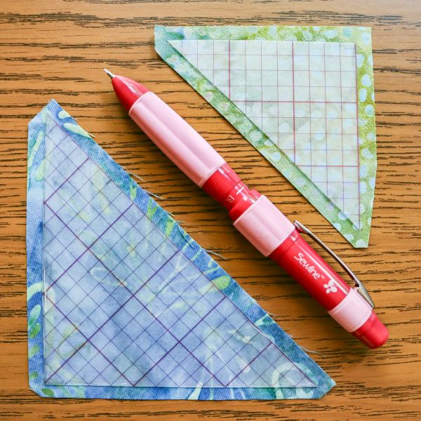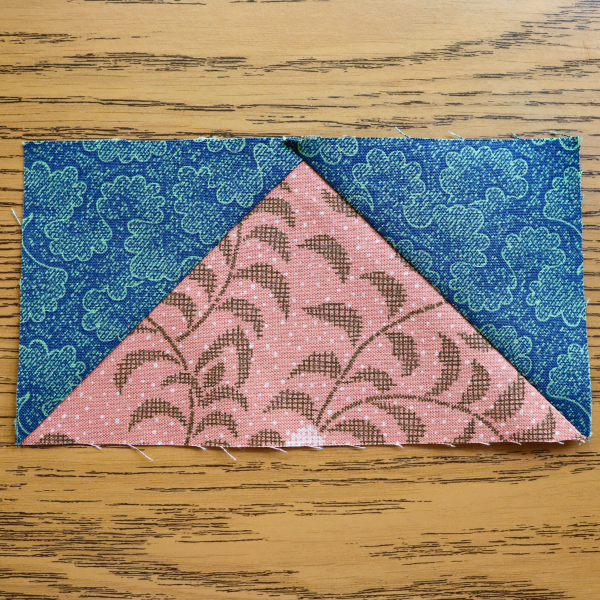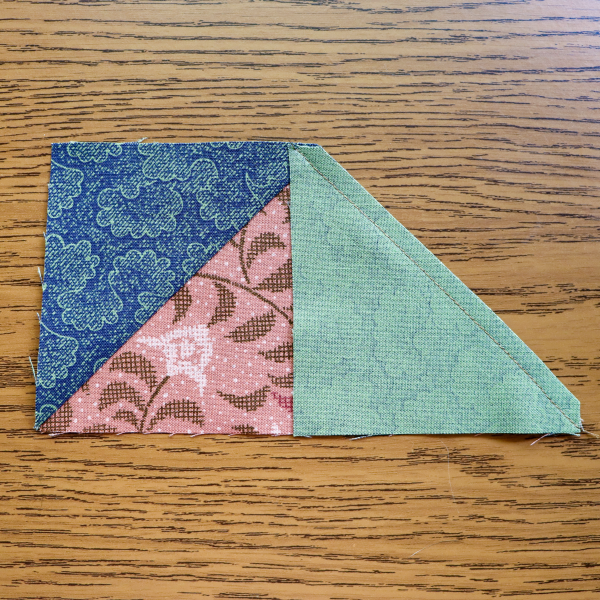 - Place the other Star Point right sides together with the Sky triangle and sew along the diagonal edge with a ¼" seam. Press the completed unit flat.