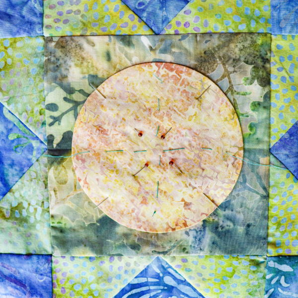 The sun petals will be stitched down first, but the circle is the defining feature, so I decided to make it first and then use it to help design the petals. I love Karen K. Buckley’s Perfect Circles for appliqué. I auditioned her Bigger Perfect Circles until I found one the size I liked.