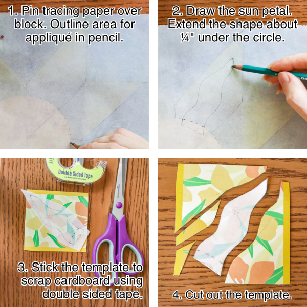 Place tracing paper over the block and pin. Use a pencil to outline the area to be appliquéd. To draw the petal, I used S shaped movements. I played around with different shapes inspired by flower petal shapes but liked this one better. I kept curves gentle and a touch of bluntness towards the tip so there would be room to tuck layers of fabric together.