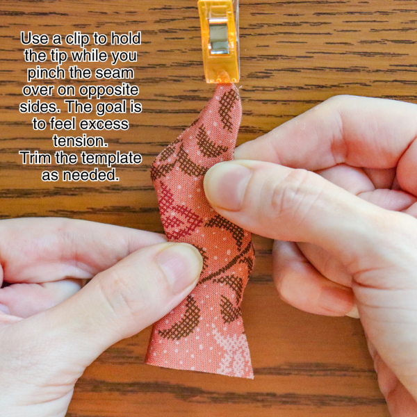 Hold the folded tip in place with a craft clip or pin, then draw the edges of the fabric around the template, finger pressing the seam allowance. You’re feeling for excess tension or sharpness in the shape that will be hard to stitch. Trim the template, if needed.