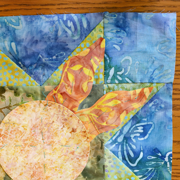 When I chose fabrics for the block, I imagined a forest island with coastal wetlands surrounded by an ocean of butterfly fishes. It became a magical place I went to every time I stitched. It had worked, I was ready to play and it was time to reimagine the scene. An idea came on the longest day of the year. As I stitched, I imagined what it would be like to look down upon my magical quilt forest island from above the sun.