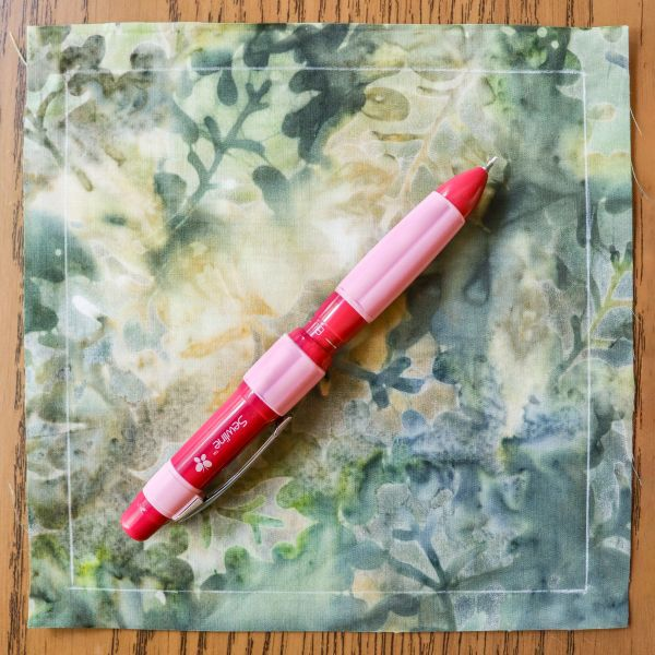 Ensure the bobbin is wound with the topstitching color you want, since it is being stitched to the top layer of the block and will be visible. Using a walking foot if desired, or simply sewing slowly and adjusting as needed, sew on the marked shape line.