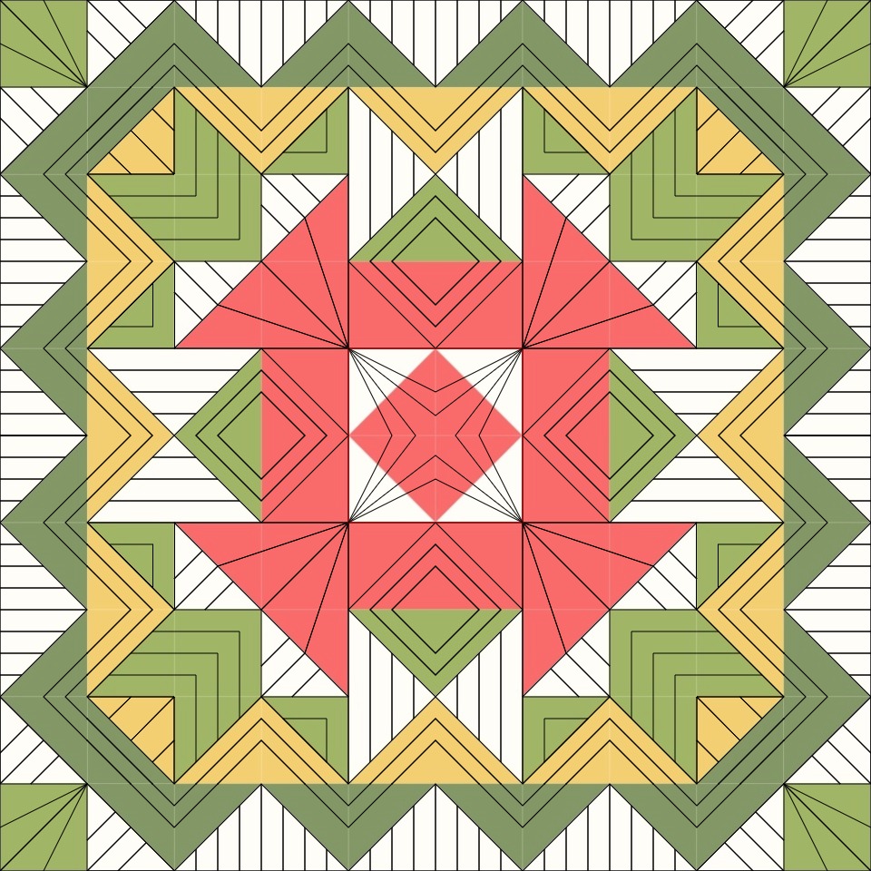Referring to the diagram below, arrange the following pieces as shown. An olive 8½″ square, three olive/gold HST, a dark green/gold HST, a coral/white HST, and two dark green/white HST.