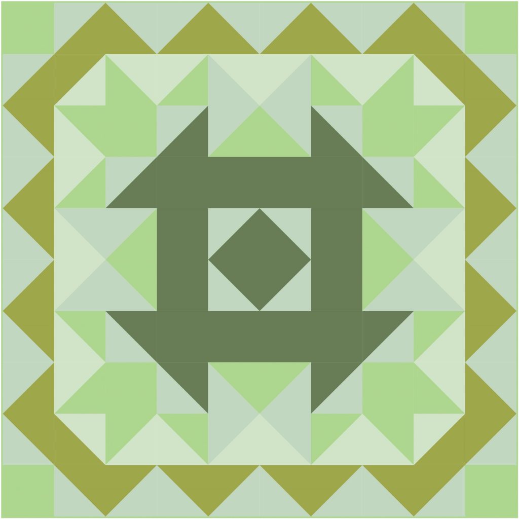 Referring to the diagram below, arrange the following pieces as shown. Two olive 8½″squares, and eight dark green/white 8½″ HST.