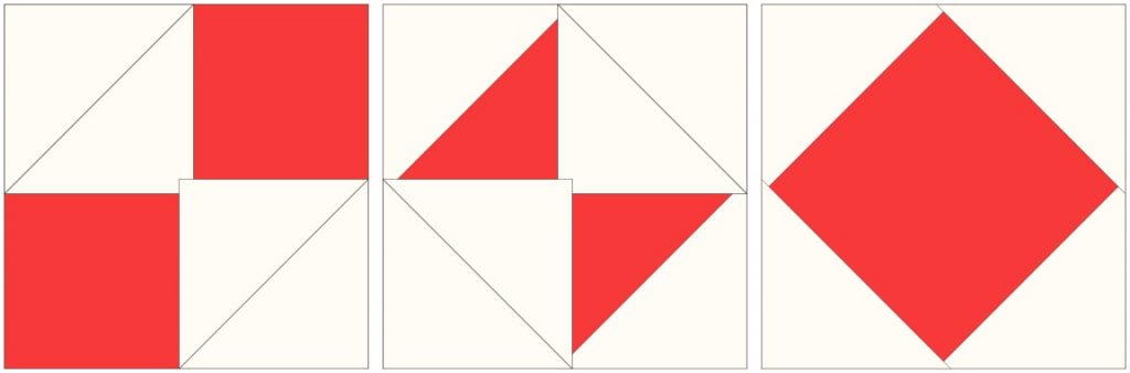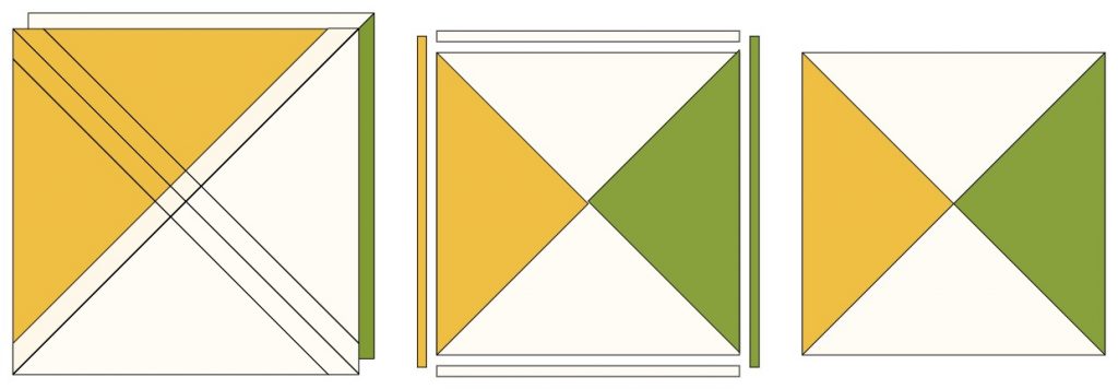 Repeat with the white, olive, and gold 17½″ [13½″] squares, but skip the trimming step, to make the following HST for the next unit: