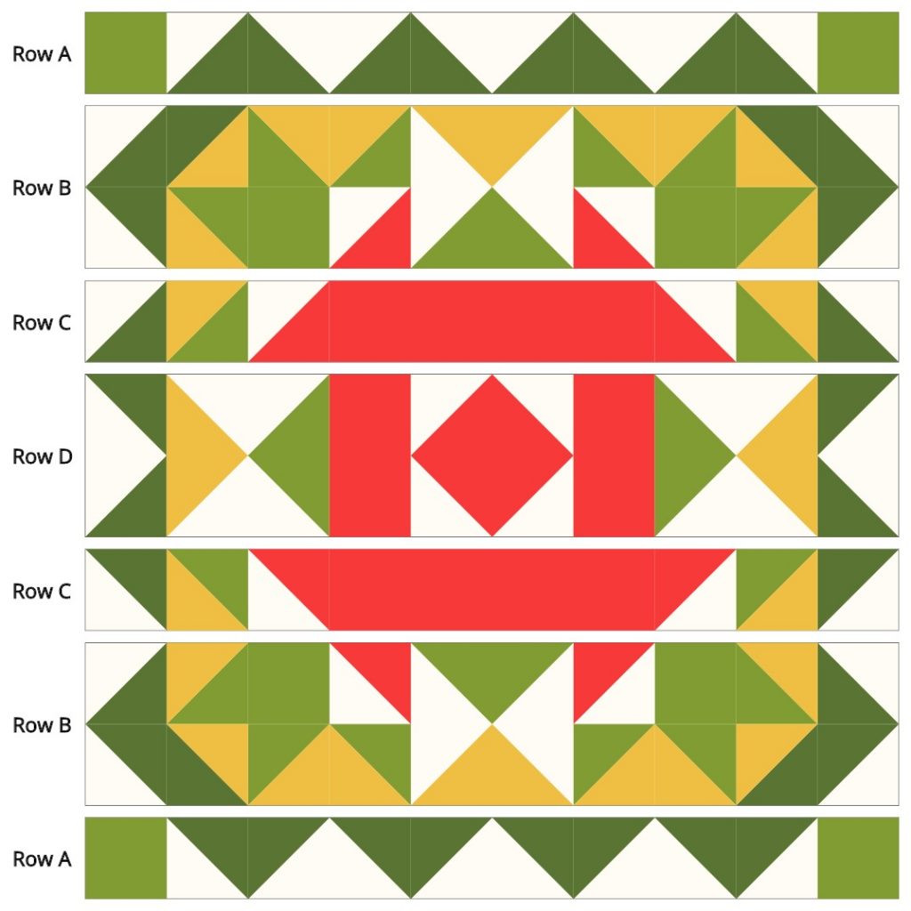 Sew the dark green/white HST into pairs. Sew the pieces into a row. Row D measures 16½″ x 80½″ unfinished. Make 1.