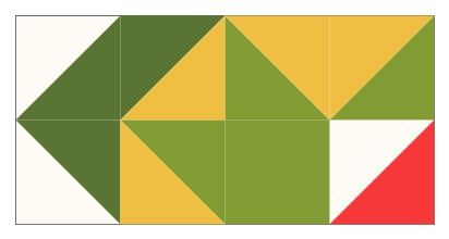 Referring to the diagram below, arrange the following pieces as shown. Two dark green/white 8½″ HST, two olive/gold 8½″ HST, two coral/white 8½″ HST, and a coral 8½″ x 32½″ rectangle.