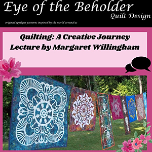 “To live a creative life, we must lose our fear of being wrong.” –Joseph Chilton Pearce. Life and quilting have much in common. We are shaped by our pasts, but not limited by them. When we find a creative expression, like quilting, we have the opportunity to take what we have and create something of beauty out of it. Both life and creativity are journeys that require faith, hope, and trust in the process. Get a glimpse into the quilting life of the founder and creative force behind Eye of the Beholder Quilt Designs. Come hear about Margaret’s creative journey as seen through her quilts.