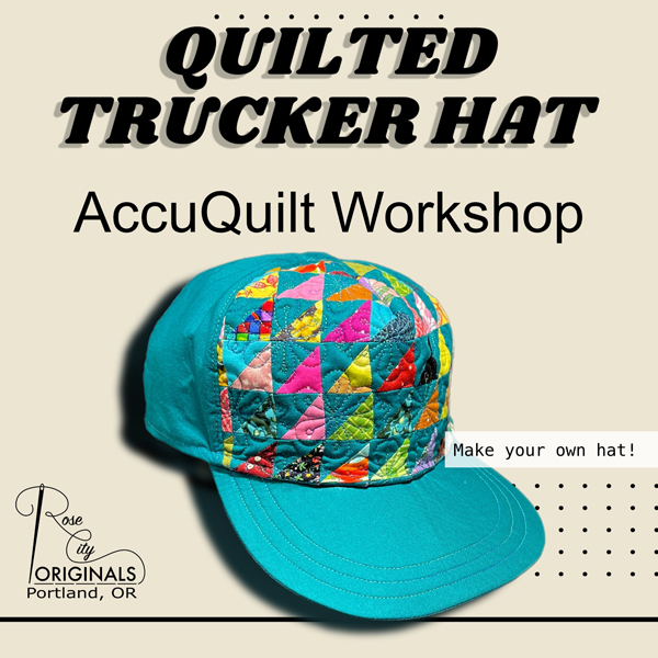 In this workshop, students will make a complete Quilted Trucker Hat utilizing the AccuQuilt GO! Quilted Trucker Hat die by Chris Marchini. Starting with two Fat Quarters and various interfacings, students will build their hat from scratch and walk away in style with their new one of a kind hat. This workshop mixes quilting and clothing construction to help students build their skill set and branch out to new things. A printed pattern with templates is also available.
