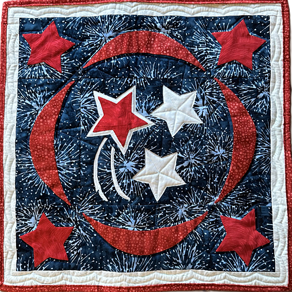 Reverse appliqué gives a unique, dimensional look to a quilted piece because the design is made in the background fabric, the negative space, peeking out of the top fabric! The Shooting Star block has added dimension with an appliquéd star inside a reverse appliqué star. The Shooting Stars table décor set pattern has directions for a table runner and 4 placemats. In the workshop you’ll make a placemat with its single Shooting Star block, four appliqué stars, and bunting swags. You will learn how to make the block by hand with reverse appliqué. See how easily you can stitch when you trace, baste, snip, and stitch, and get pointers on your hand stitch work. See the exploding red, white, and blue dimensional beauty of the 8” Shooting Star block for the Shooting Stars table décor set pattern revealed as you stitch. Come be empowered as you make a placemat/pillow top. Learn with others and experience the fun and beauty of reverse appliqué with appliqué by hand.
