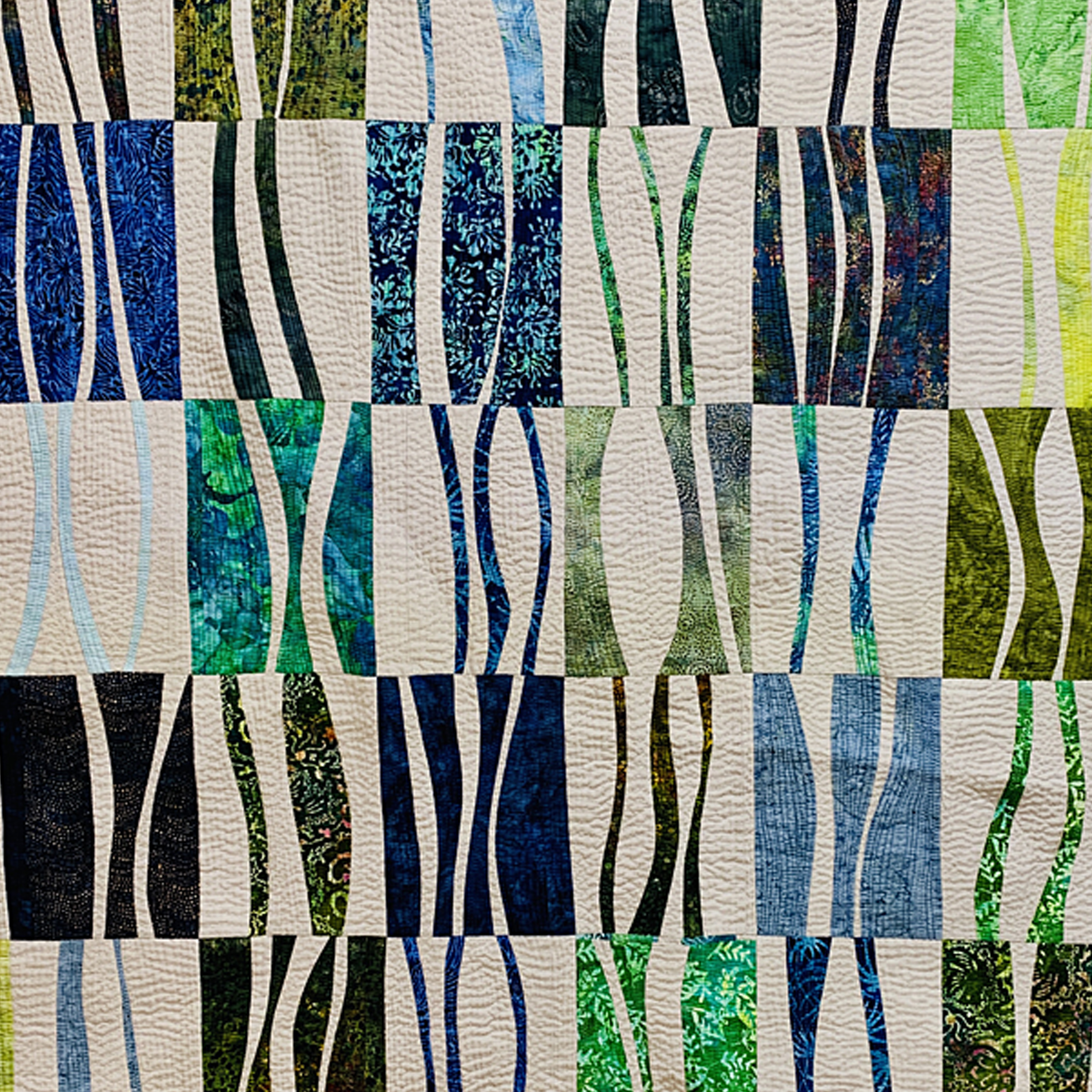 Eel Grass and Eddies is a great workshop to "get your feet wet" with improvisational curved cutting and piecing. Two fabric rectangles yield two reverse image blocks that can be used as is or cut into smaller units. In this half-day workshop, you will make several of the reverse image units. This is a technique class on curves and is fast and fun! Detailed instructions in the handout will help you finish the quilt at home.